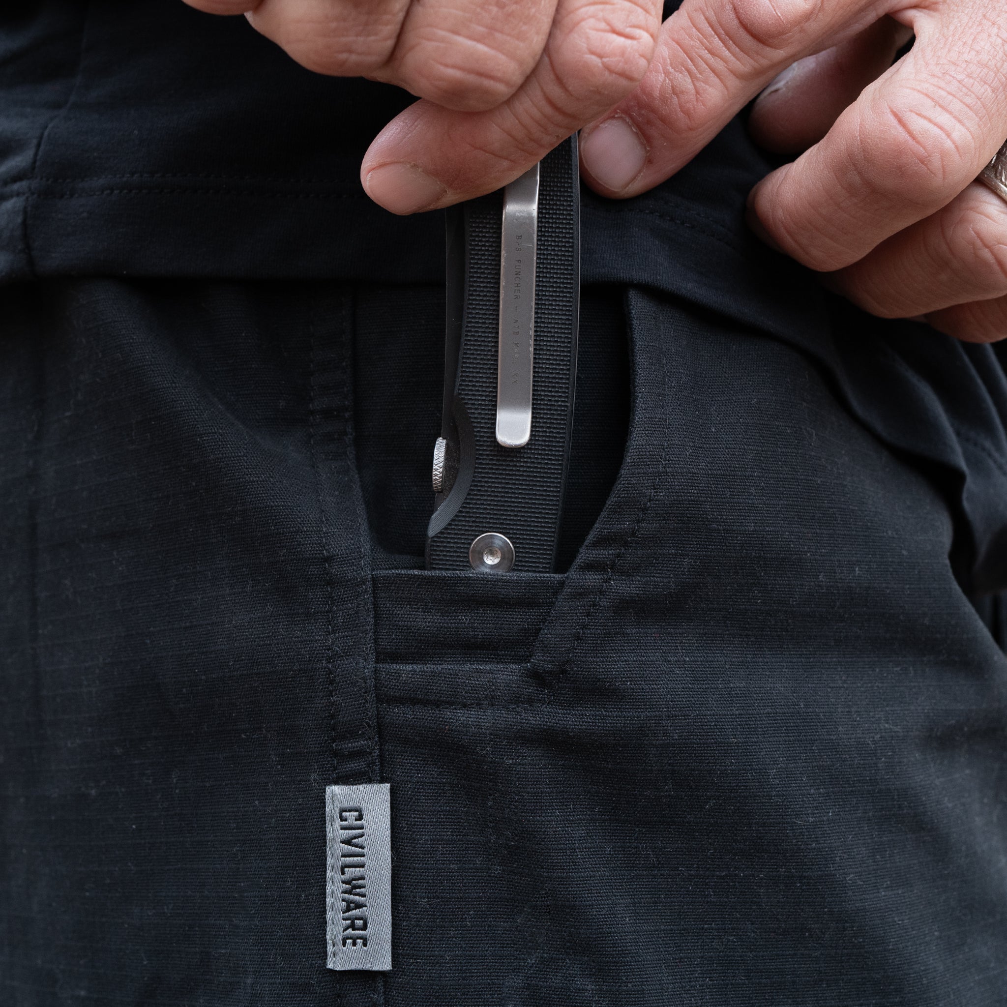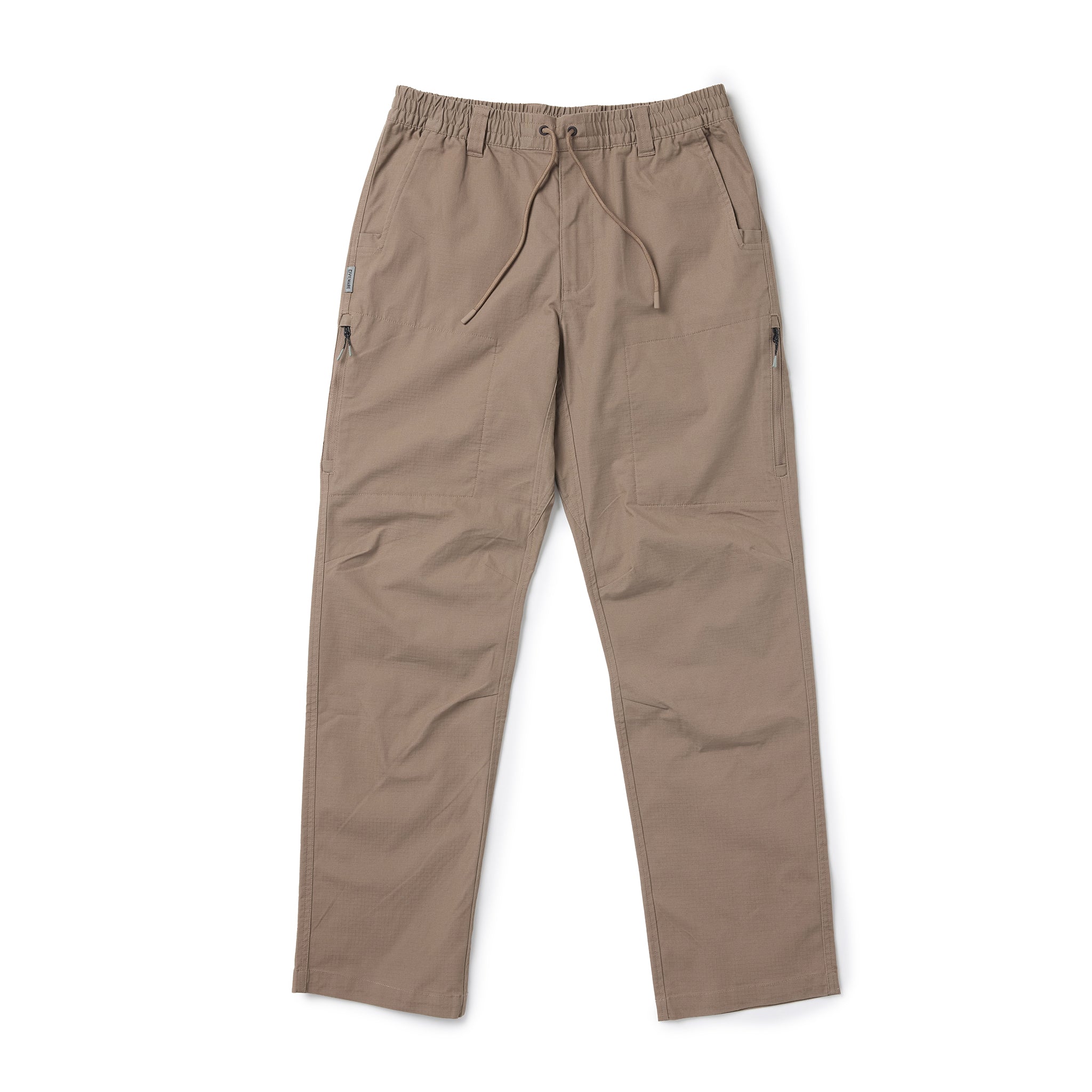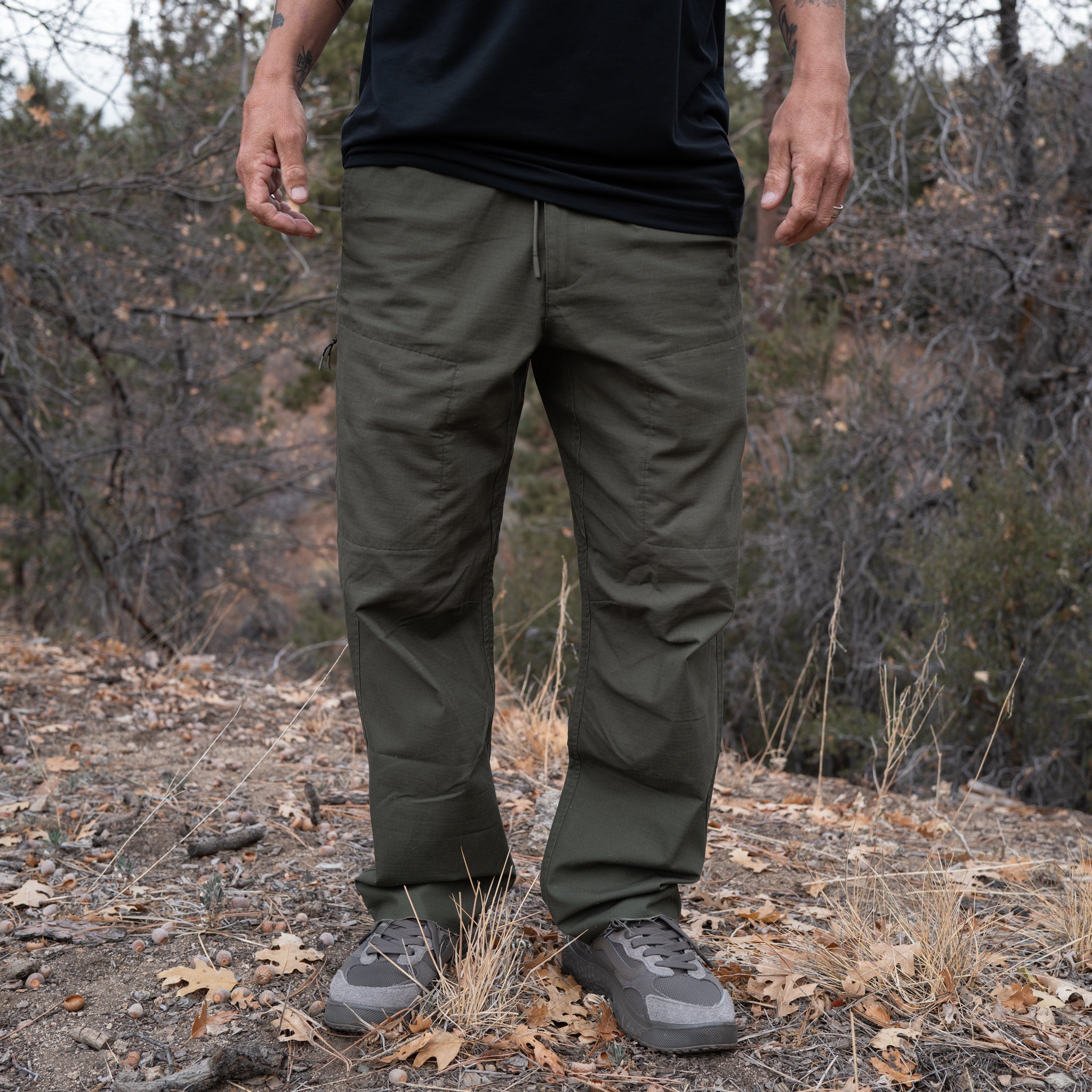 The all-terrain, all season, everyday pant. Built for a range of environments. A relaxed fit with articulated legs for range of movement. Drawstring elastic waistband and wide belt loops. Vented zippered pockets for safe storage or to release heat. Vented mesh seam above back pockets for more heat release. A soft, quiet, durable and comfortable cotton/poly blend fabric.