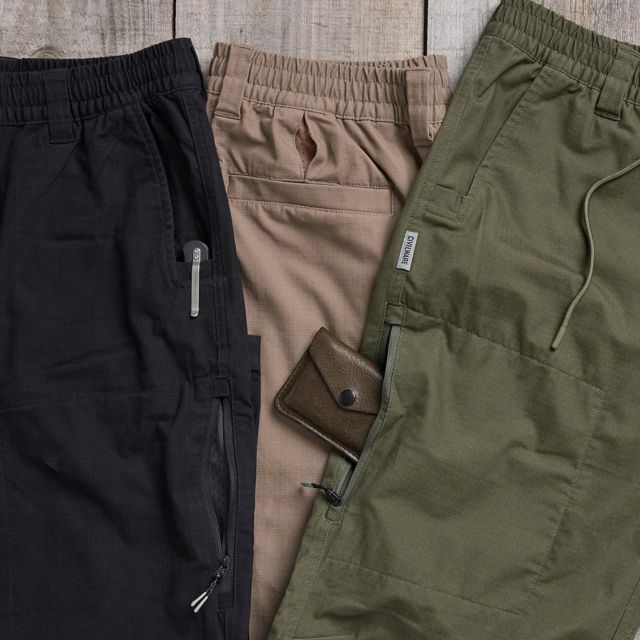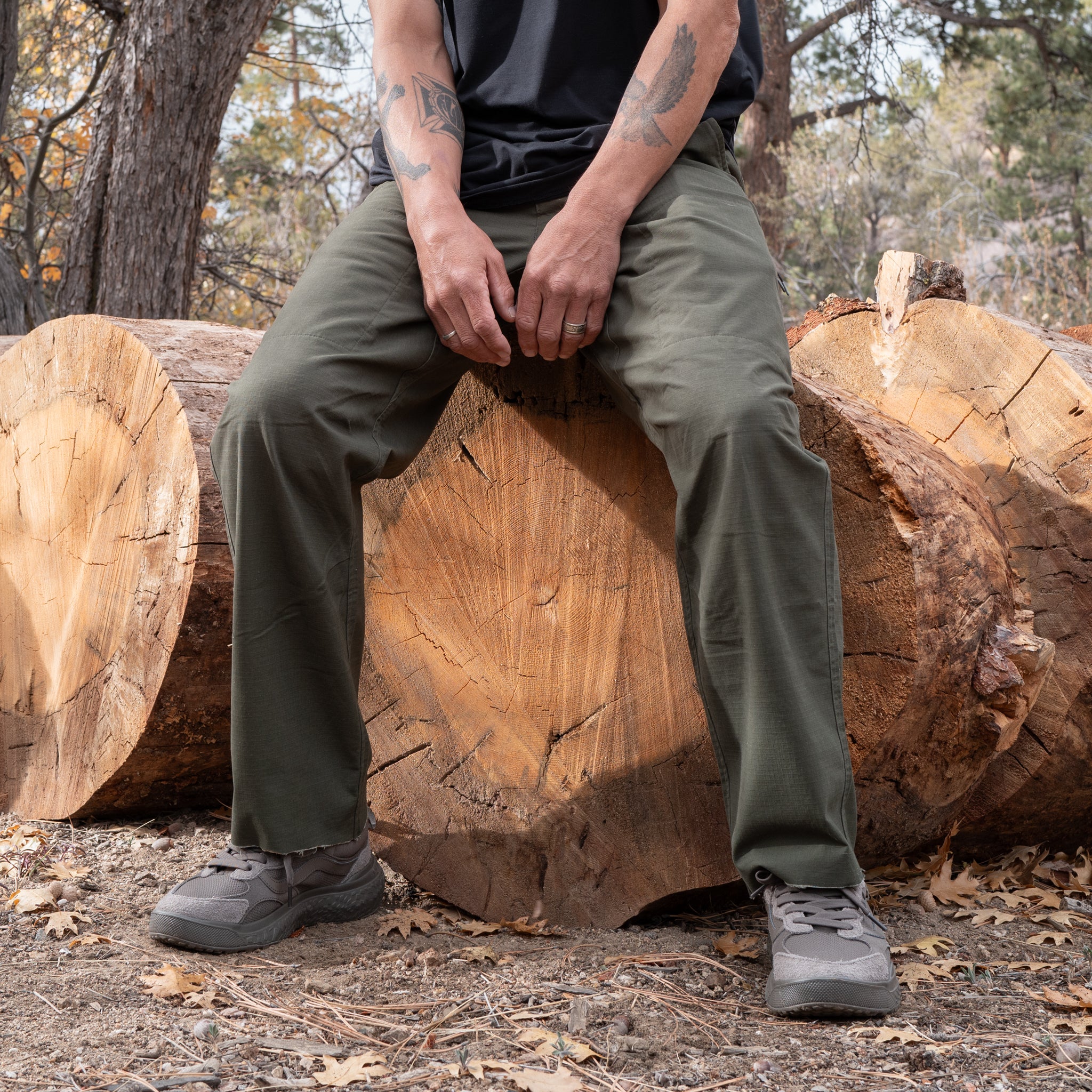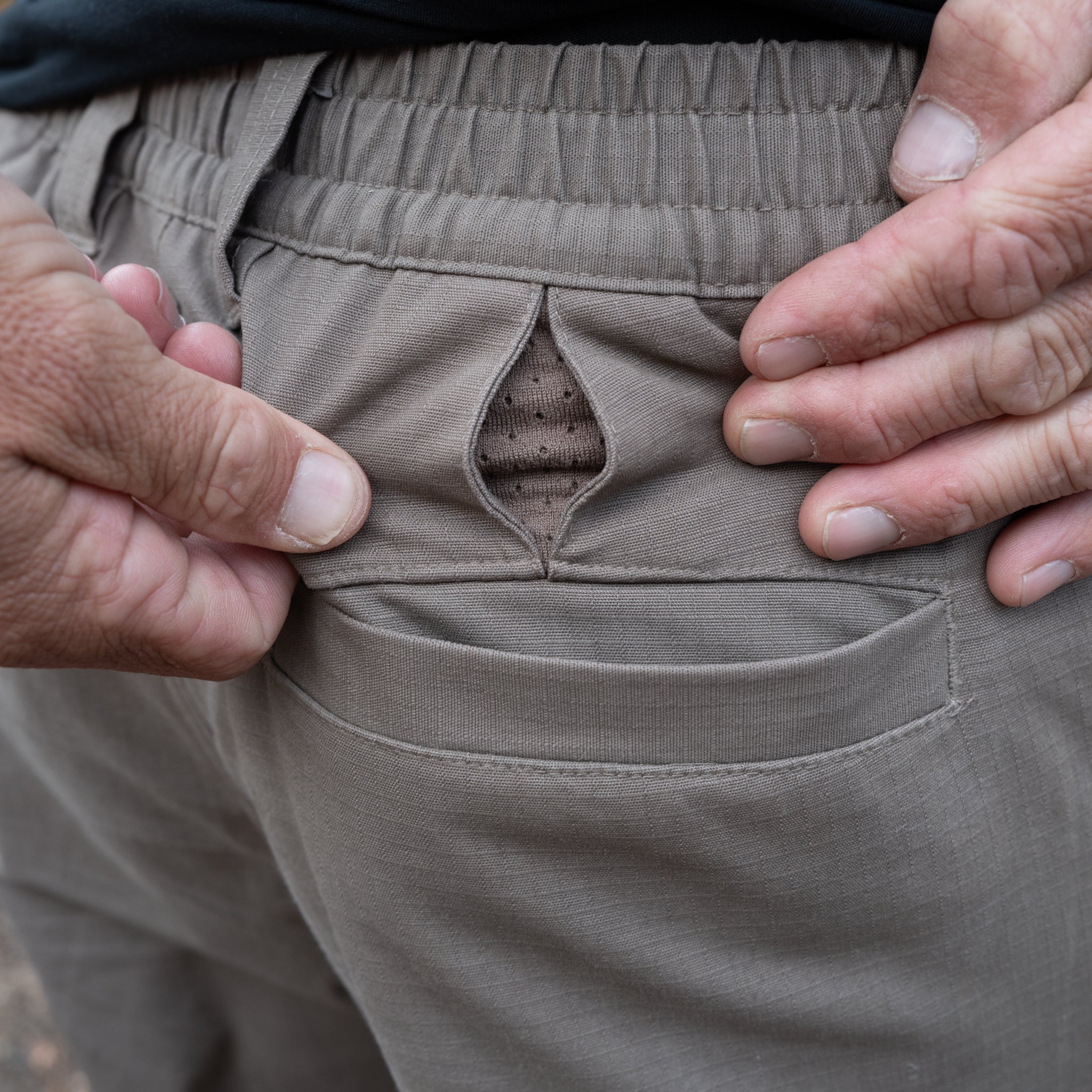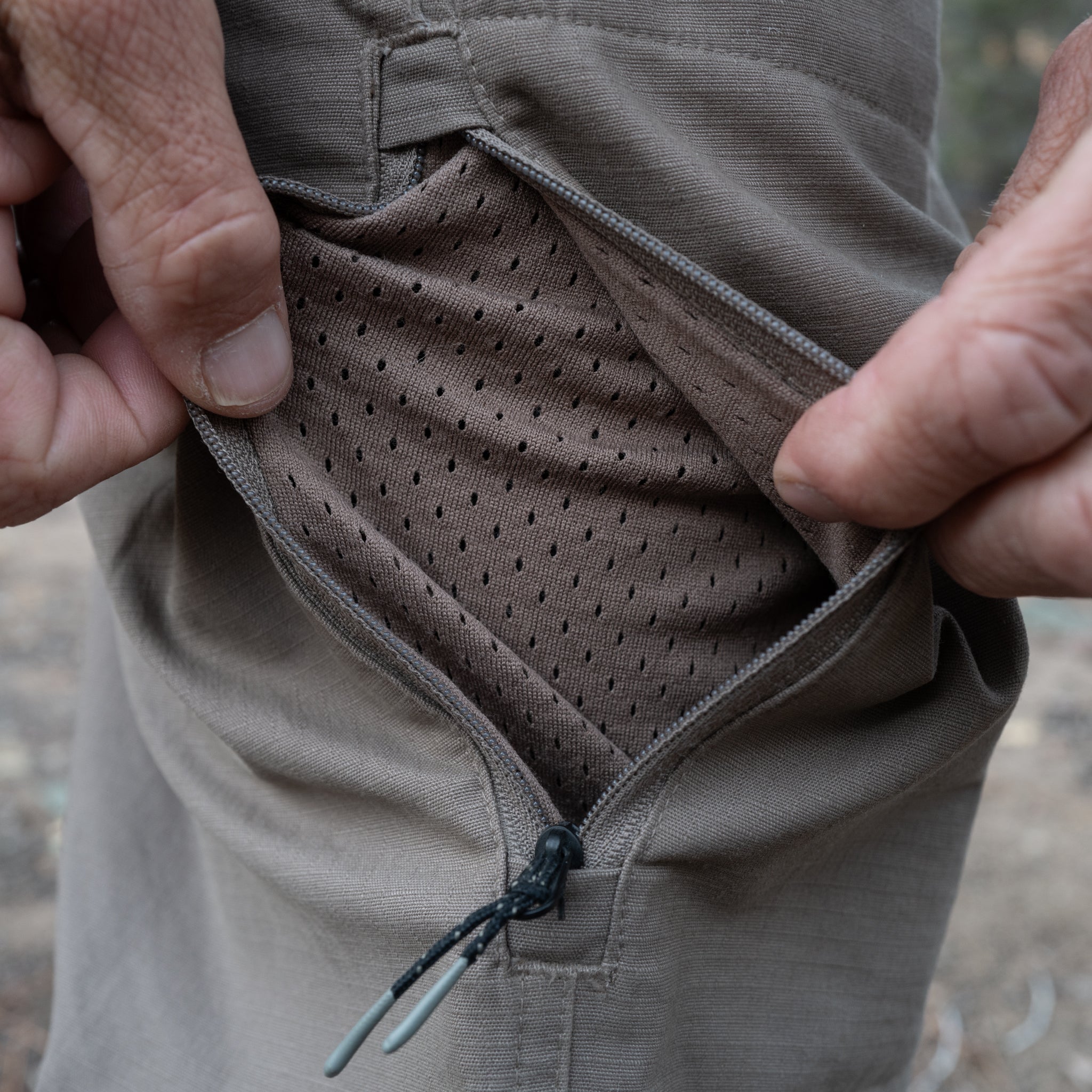 The all-terrain, all season, everyday pant. Built for a range of environments. A relaxed fit with articulated legs for range of movement. Drawstring elastic waistband and wide belt loops. Vented zippered pockets for safe storage or to release heat. Vented mesh seam above back pockets for more heat release. A soft, quiet, durable and comfortable cotton/poly blend fabric.
