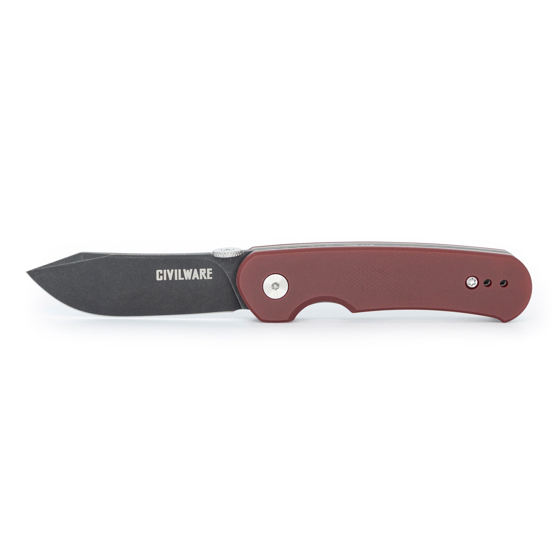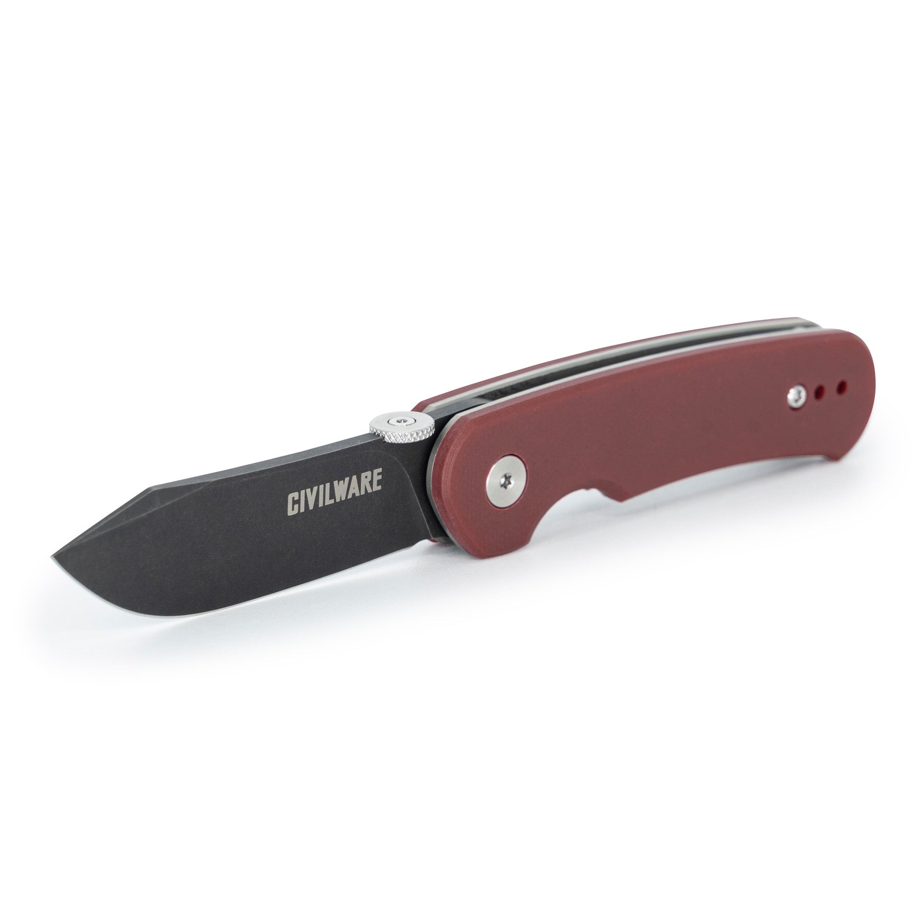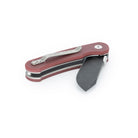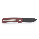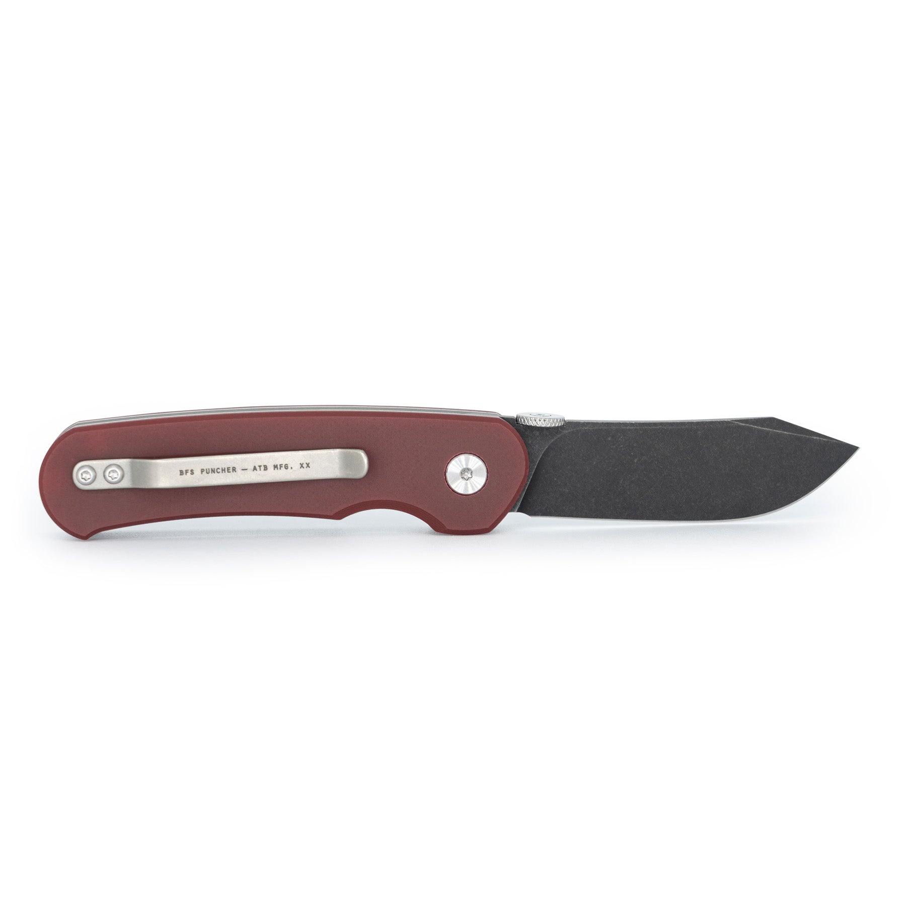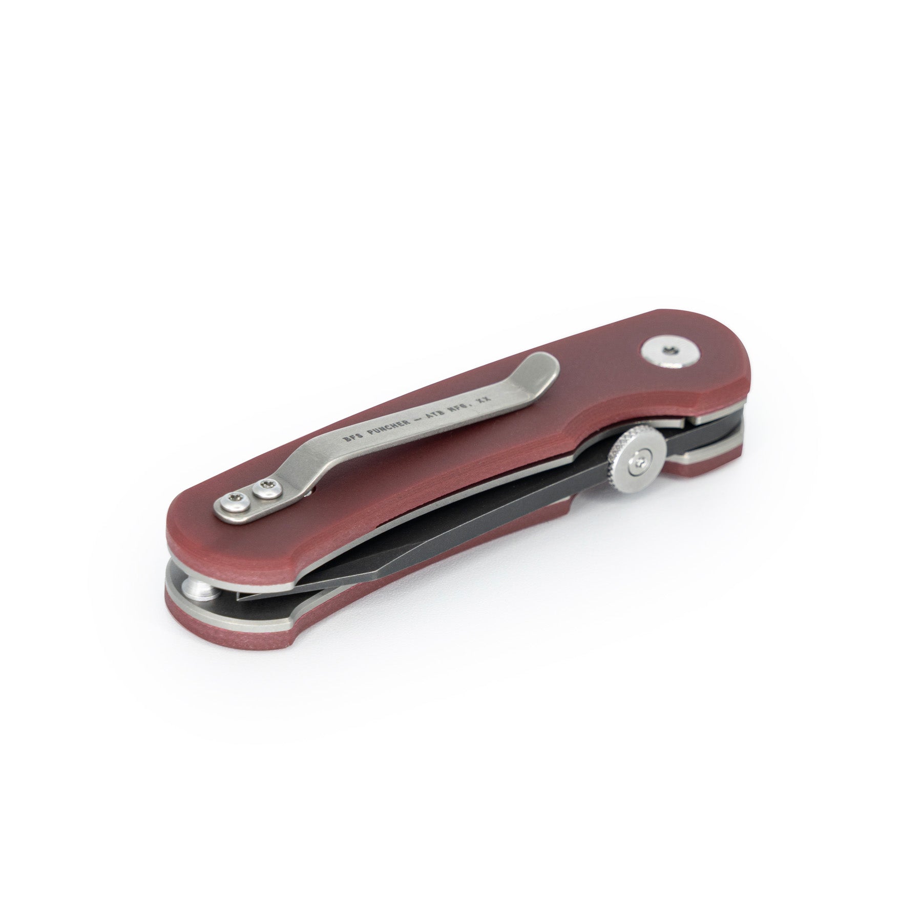 "Built for the West"  - The Puncher, a 'modern traditional' pocket folder inspired by the lifestyle of the west.  To be used, abused, then handed down to the next of kin.  The Puncher Folding Knife features a recessed, ambidextrous, textured thumb disc (easy to open one-handed or with gloves), liner-lock, chamfered titanium liners, textured fire red G10 handle - and a modified drop point blade with swedge.  Minimalistic in design. It's overall size and slim profile make it a solid choice for everyday carry in any environment.  2.5" blade, 3.5" handle, 2.5 oz weight.