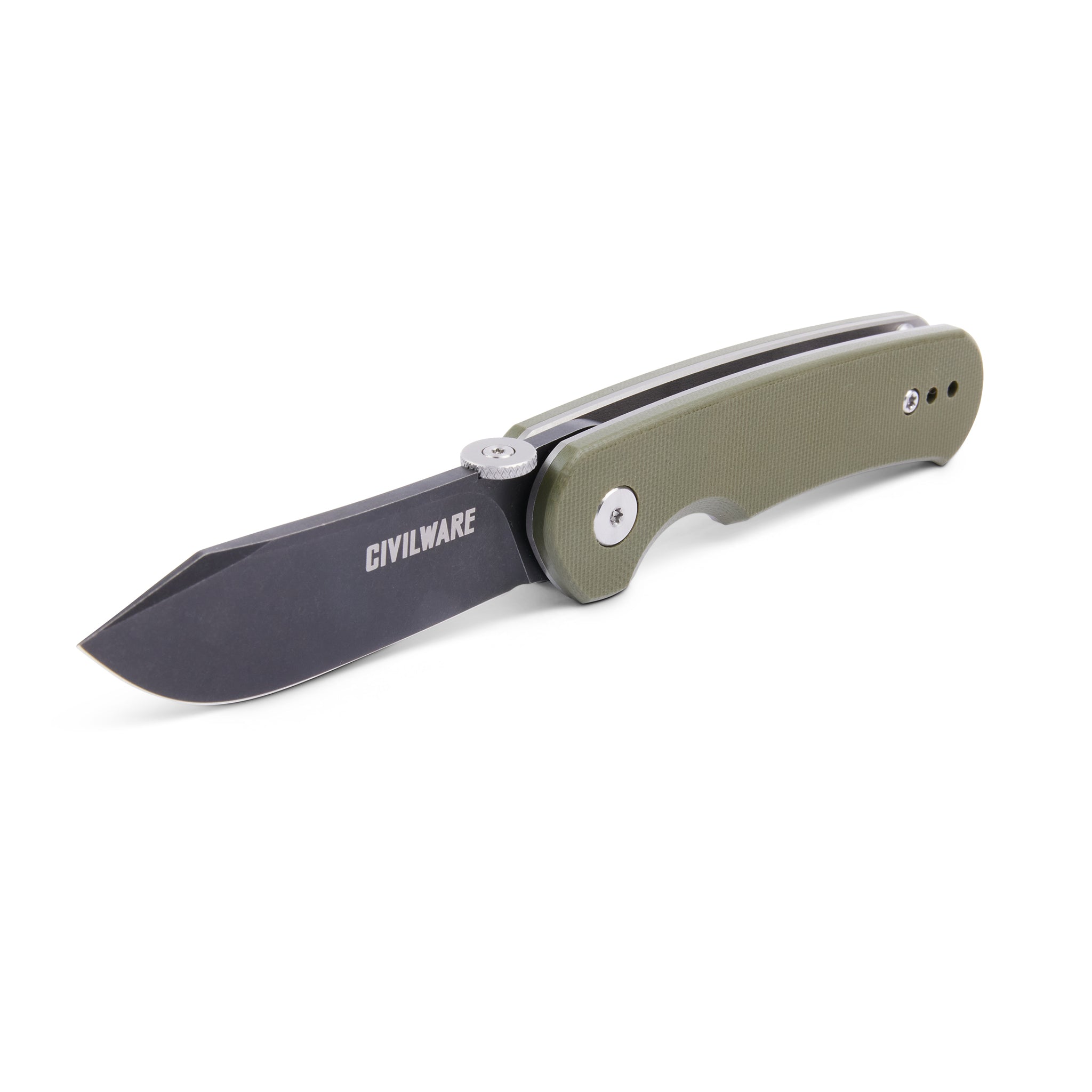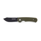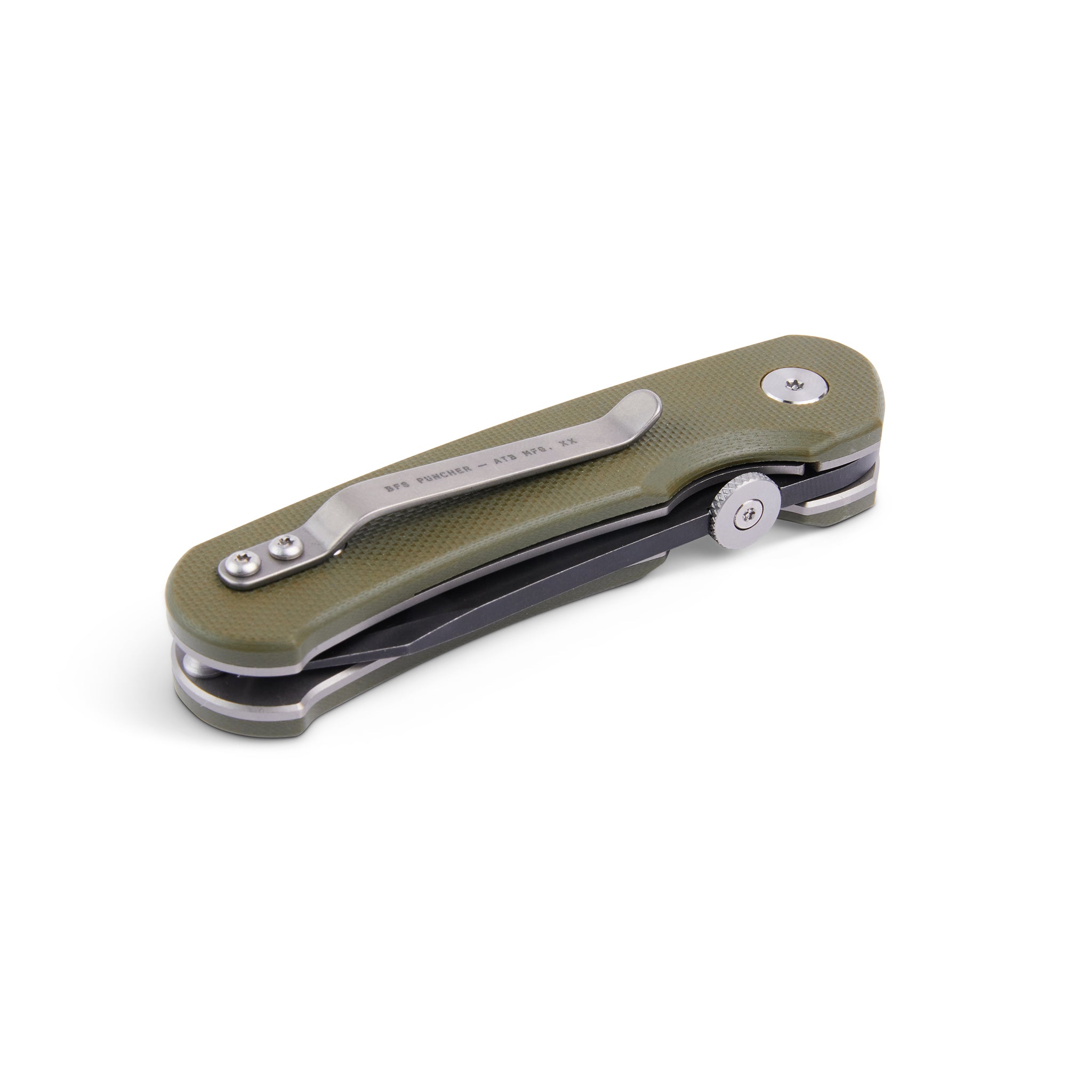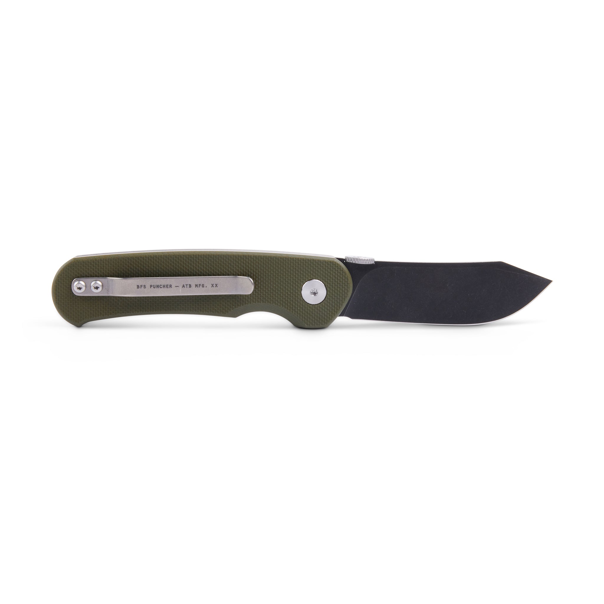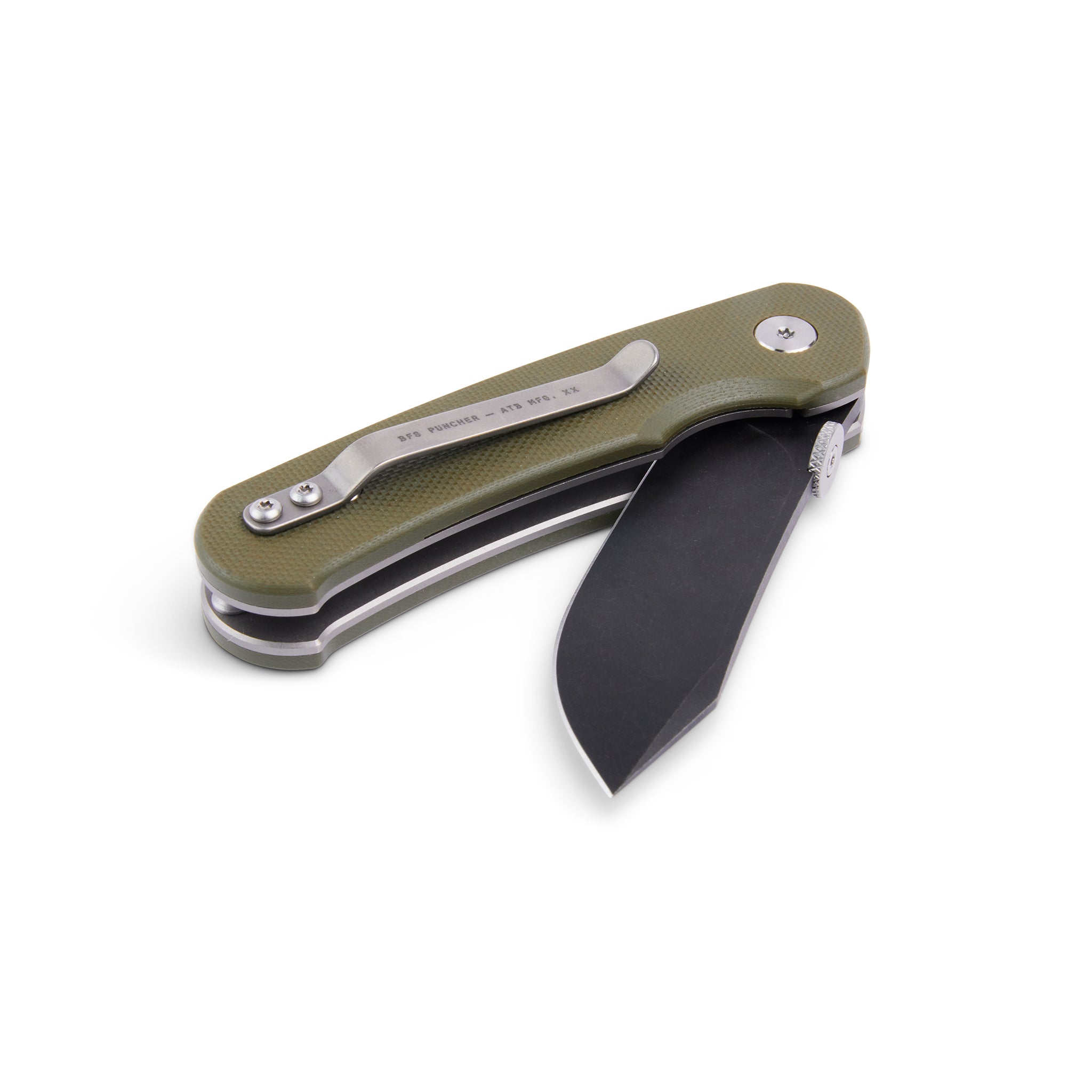 "Built for the West" - The Puncher, a 'modern traditional' pocket folder inspired by the lifestyle of the west. To be used, abused, then handed down to the next of kin. The Puncher Folding Knife features a recessed, ambidextrous, textured thumb disc (easy to open one-handed or with gloves), liner-lock, chamfered titanium liners, textured OD green G10 handle - and a modified drop point blade with swedge. Minimalistic in design. It's overall size and slim profile make it a solid choice for everyday carry in any environment. 2.5" blade, 3.5" handle, 2.5 oz weight.