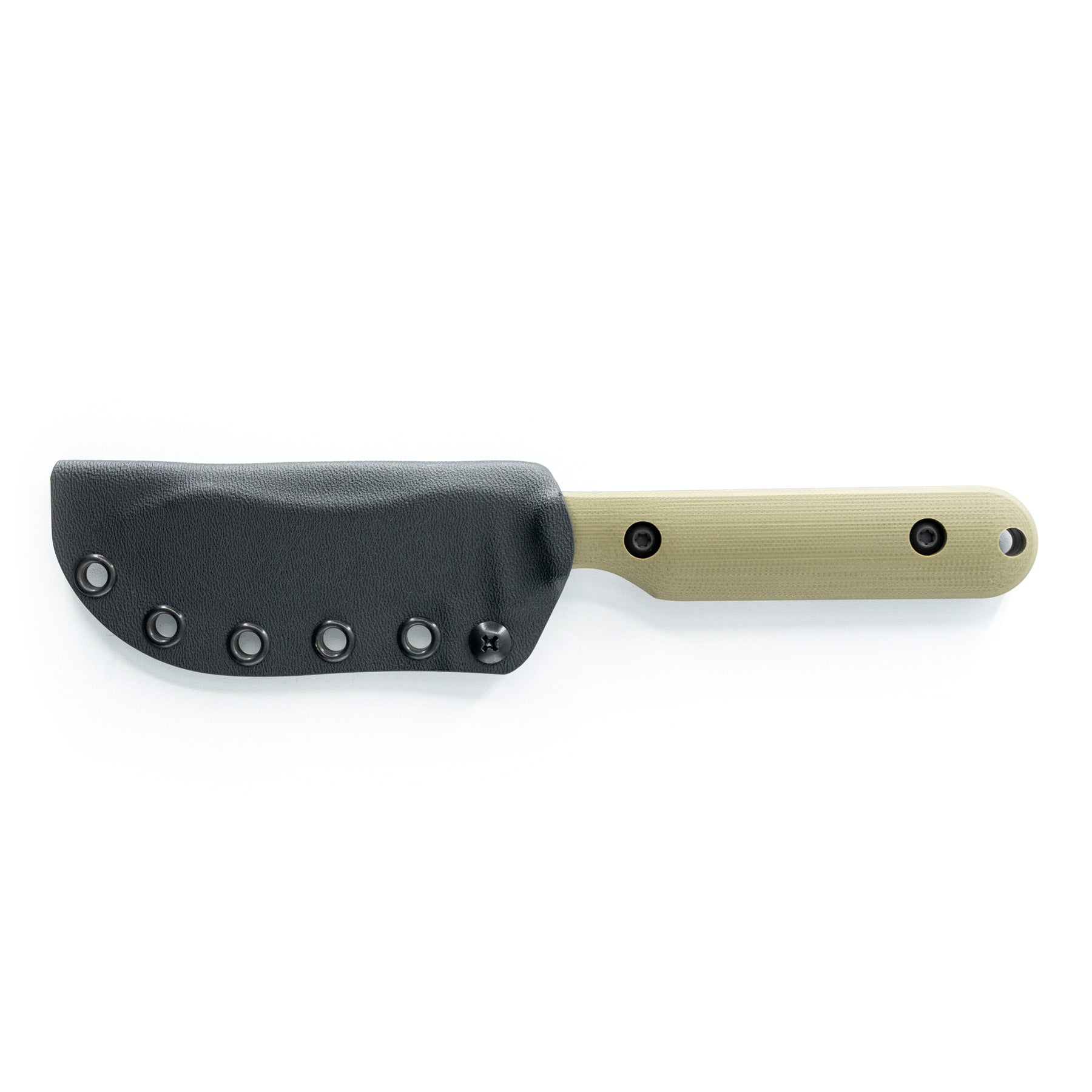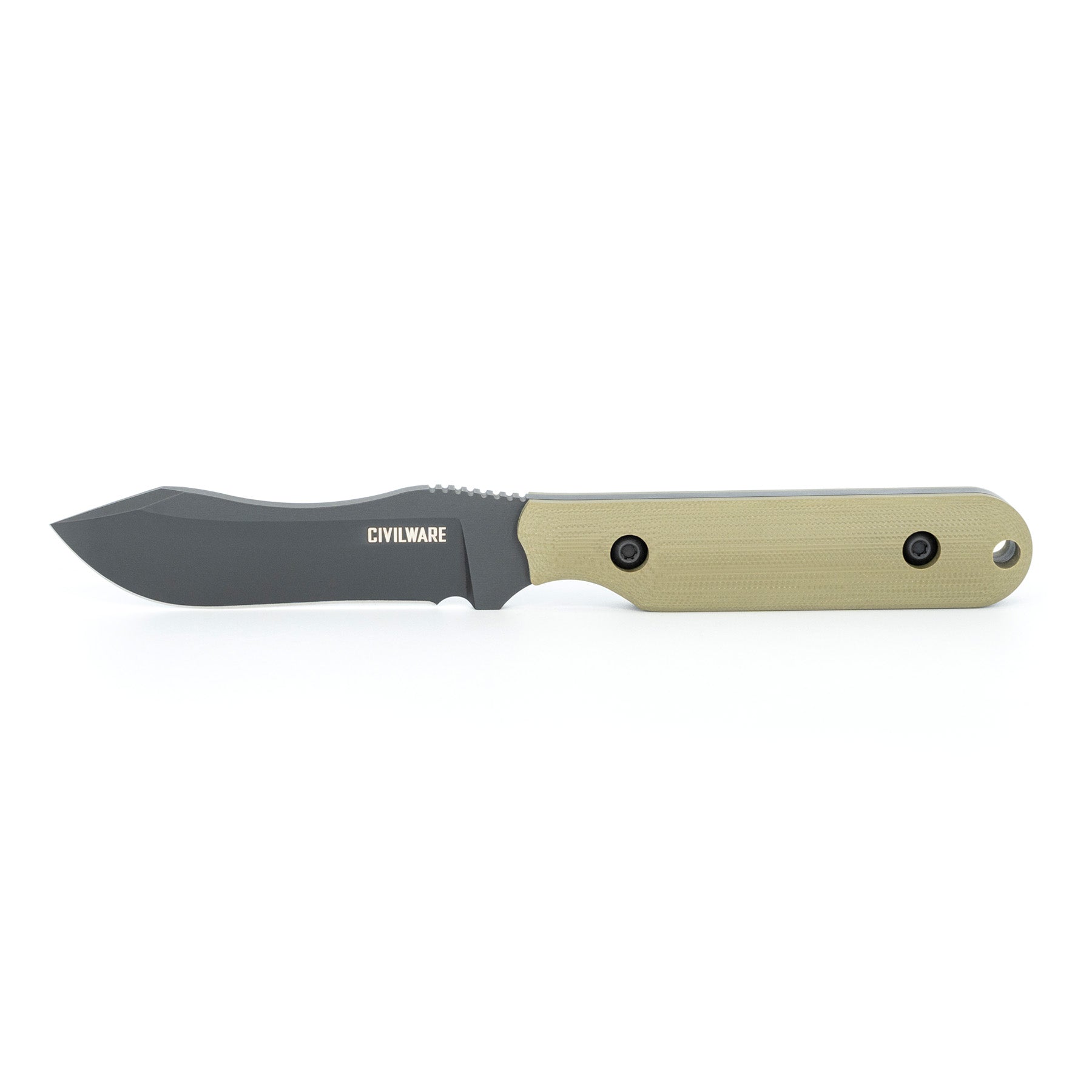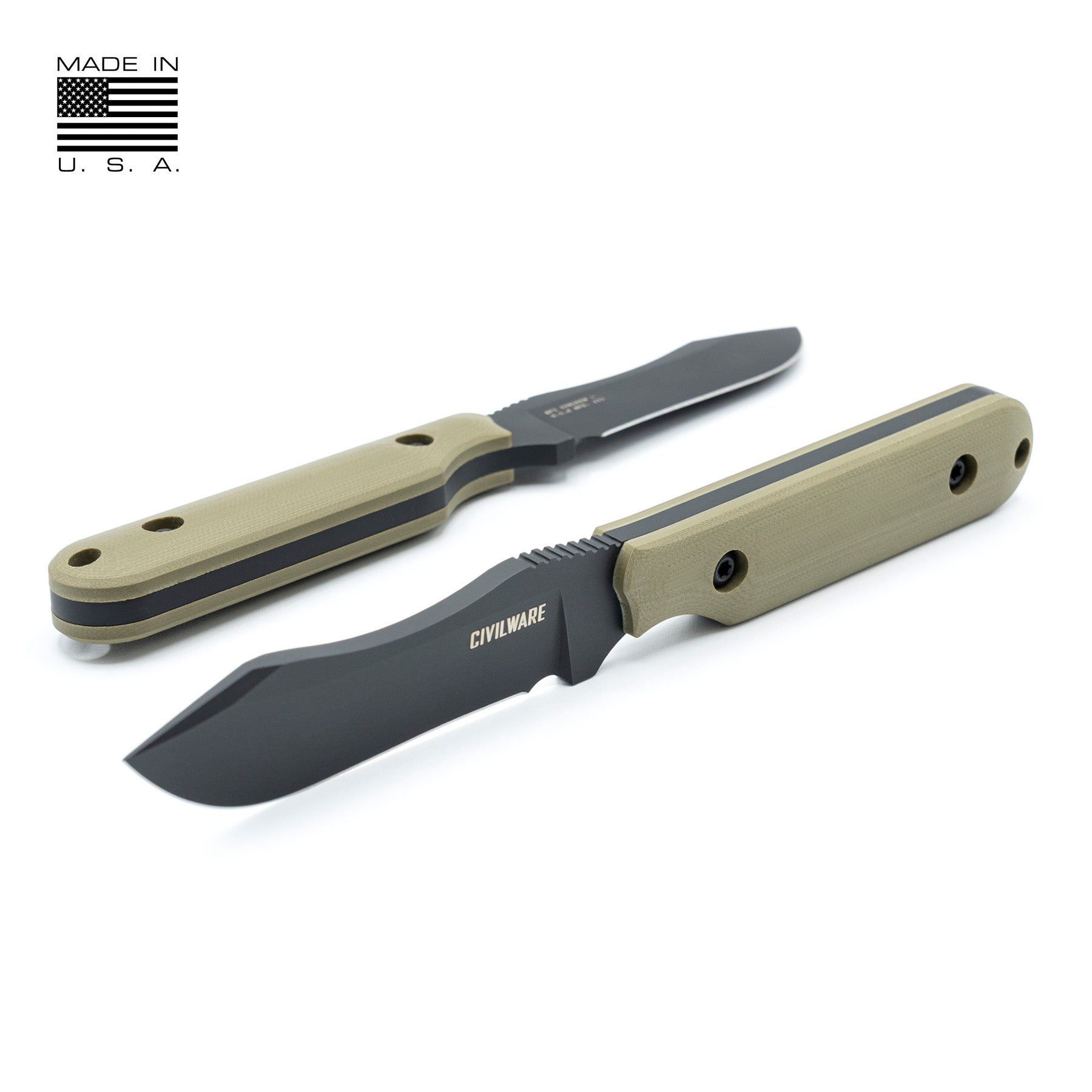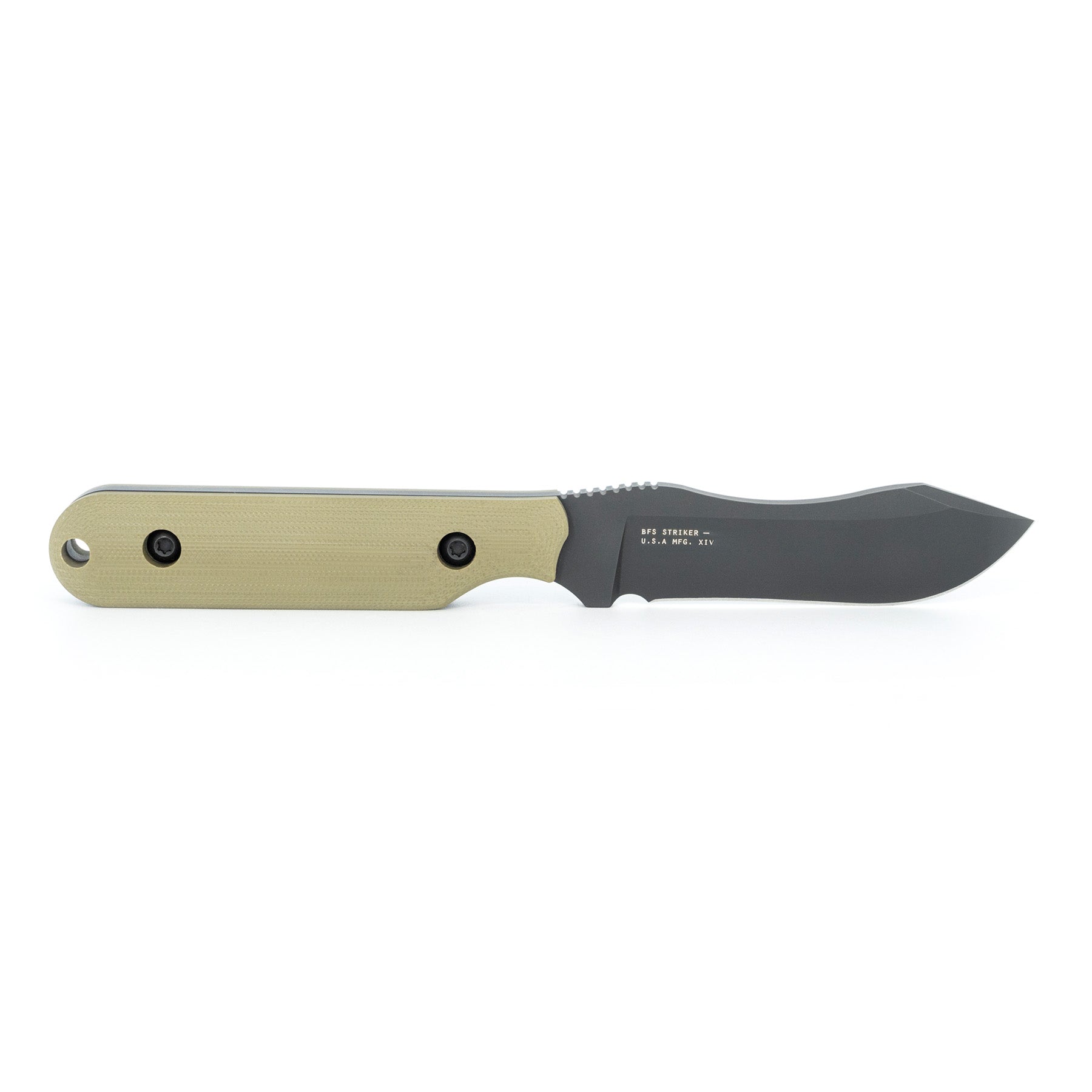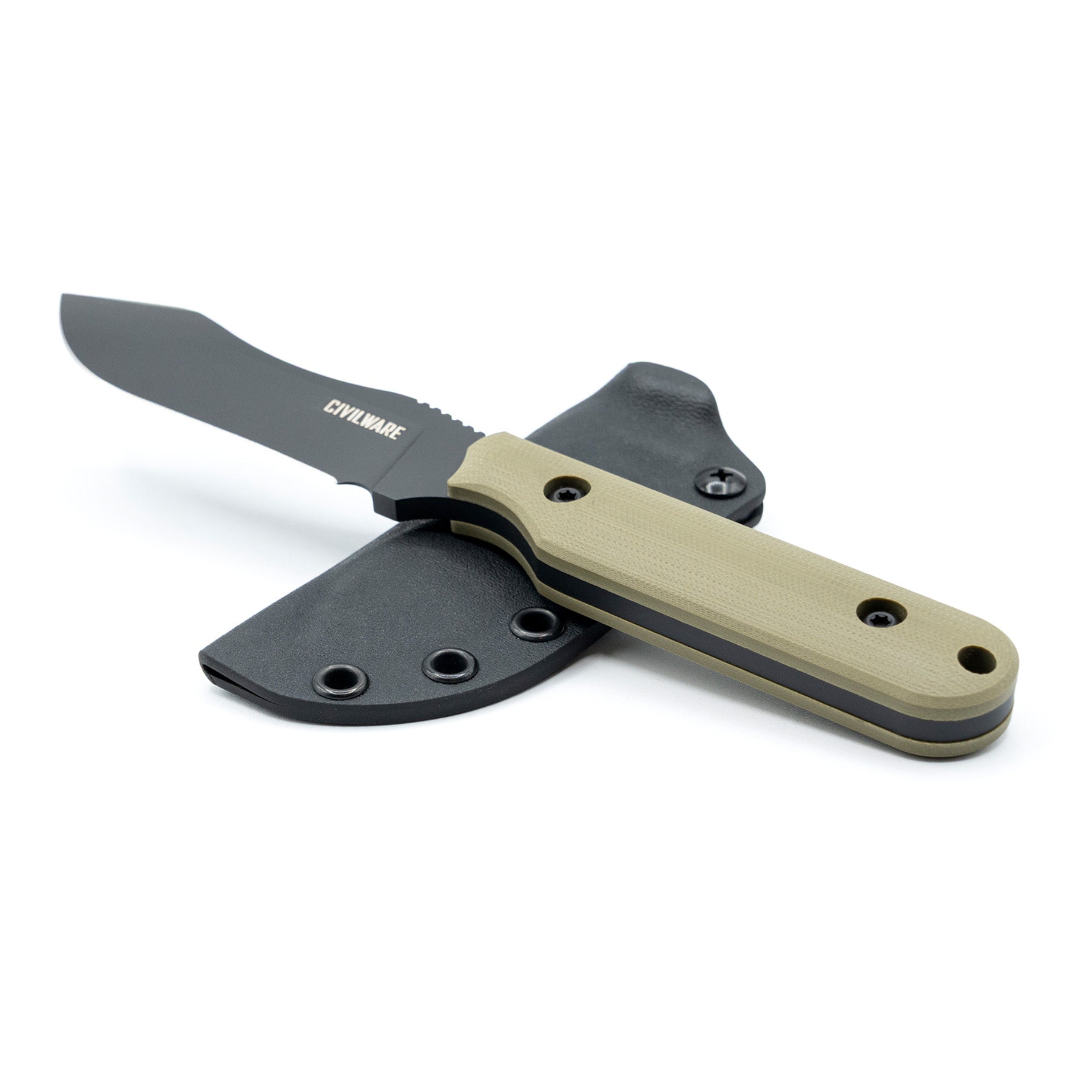 The Civilware Striker was design inspired by the hand-made knives of legendary Houndsman Ben Lilly. The Striker's shape with its recurve, pronounced belly and pointed tip make up a blade that is ready for most tasks. The straight handle is neutral, comfortable in multiple positions and full in the hand. Comes standard with a black Kydex sheath.