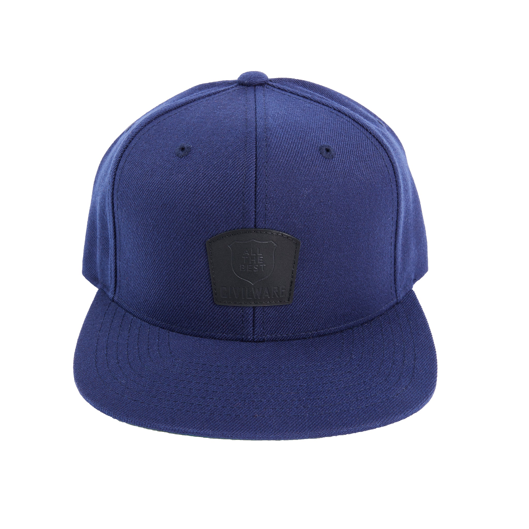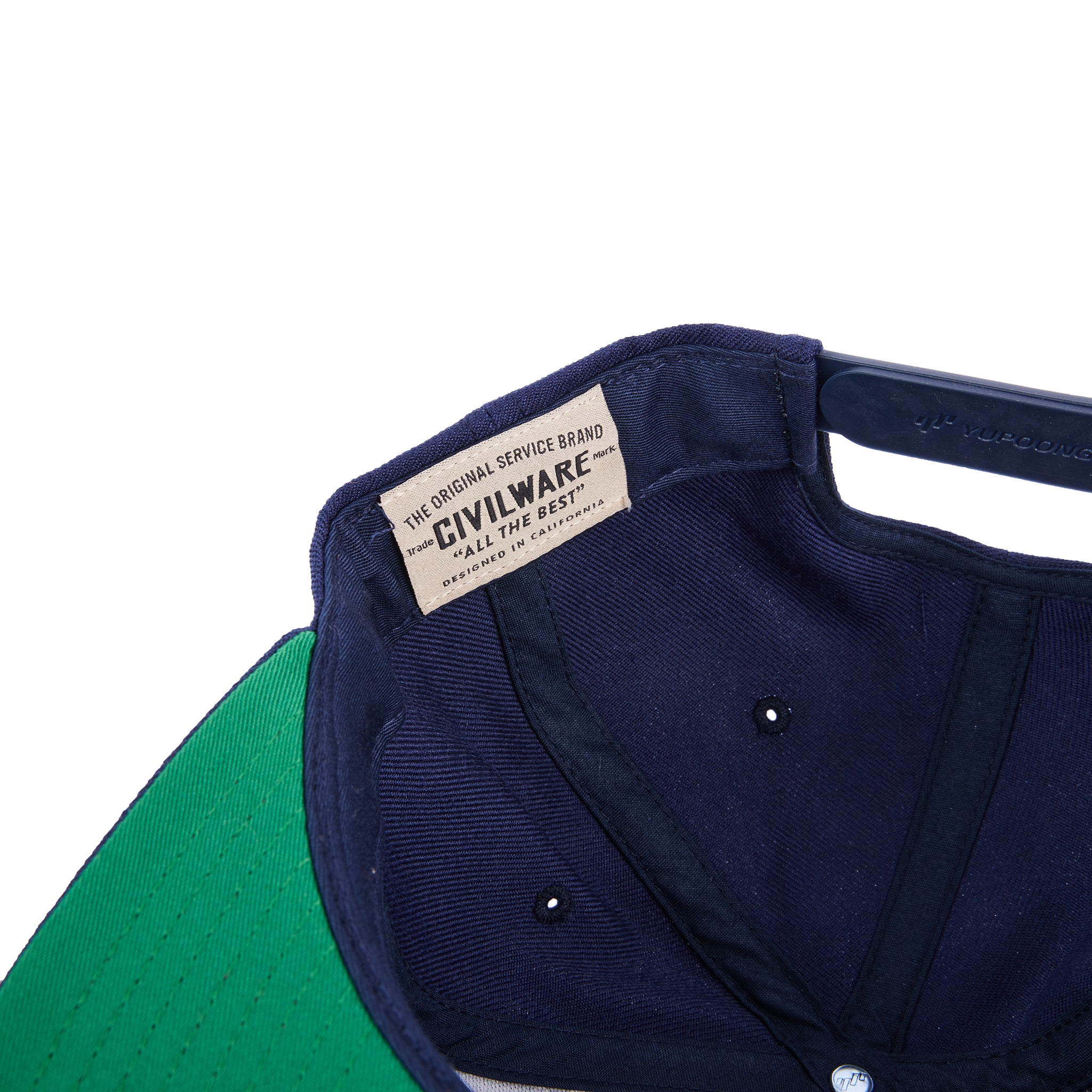 Our Our 6-panel, mid profile Guide Hat - Navy brushed cotton with a squared visor and snapback closure. Features BLACK RUBBER branded patch and green fabric under visor to shade the eyes from sunlight.