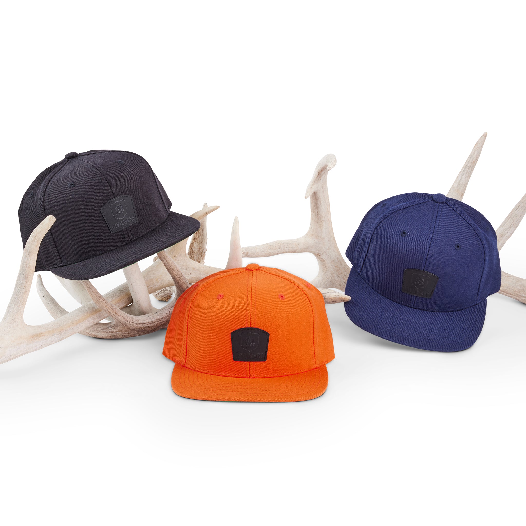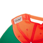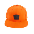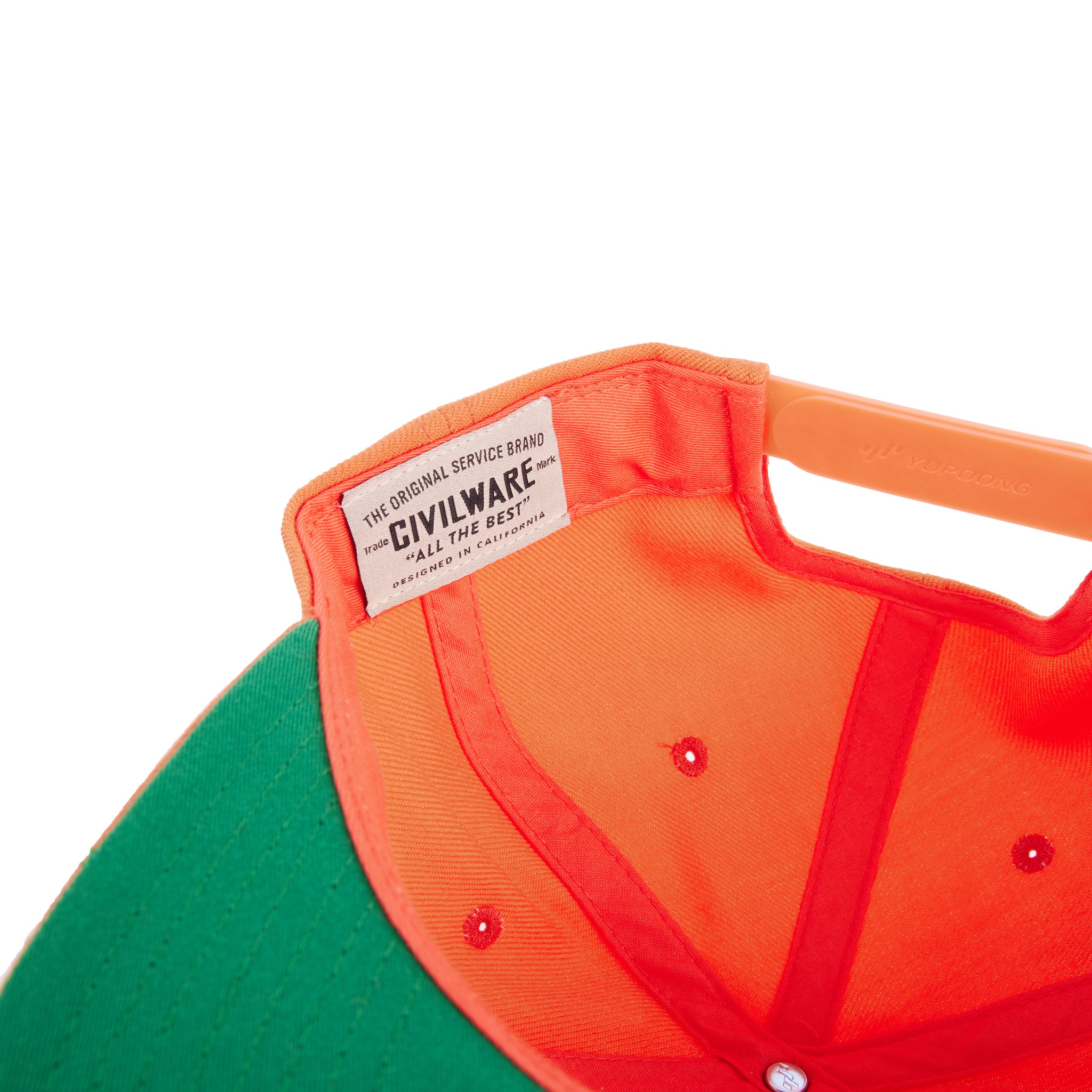 Our Our 6-panel, mid profile Guide Hat - Orange brushed cotton with a squared visor and snapback closure. Features BLACK RUBBER branded patch and green fabric under visor to shade the eyes from sunlight